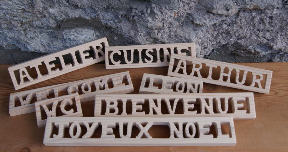 Mot ou prénom en bois d' épicéa massif pour décoration de porte, de table de mariage, de bureau...